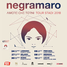 Sarà un’estate all’insegna del live per i Negramaro con 6 imperdibili concerti nei più grandi stadi italiani. La band infiammerà con il loro suono potente e inconfondibile i palchi degli stadi d'Italia.“Amore che torni” è il titolo del nuovo attesissimo album di inediti, in uscita il 17 novembre per Sugar. Un ritorno attesissimo alimentato dal grande successo del primo singolo “Fino all’imbrunire” che ha debuttato direttamente al numero 1 su iTunes, al numero 1 nella Viral 50 Italia di Spotify e al primo posto nella classifica tendenze su YouTube.Le date:24 giugno Lignano Sabbiadoro, Stadio G. Teghil27 giugno Milano, Stadio San Siro30 giugno Roma, Stadio Olimpico5 luglio Pescara, Stadio Adriatico8 luglio Messina Stadio San Filippo13 luglio Lecce, Stadio Via Del Mare“Amore che Torni Tour Stadi 2018” segue il grande successo del precedente “La Rivoluzione Sta Arrivando Tour” che ha visto i Negramaro esibirsi e infiammare i principali palchi italiani nel 2015 e nel 2016 con oltre 300.000 presenze, macinando un sold out dietro l'altro (ancora vivo il ricordo dello straordinario show al Circo Massimo di Roma il 31 gennaio 2015). Il gruppo vanta due primati: quello di essere stata la prima band italiana a calcare da protagonista il palco dell’Arena di Verona nel 2007 e quello dello Stadio San Siro di Milano nel 2008. Ogni spettacolo live (così come ogni loro progetto discografico) è frutto della condivisione di ogni singolo dettaglio fra i componenti del gruppo, seguendo sempre una linea creativa che congiunge testi, melodie e “concept” musicali e scenici